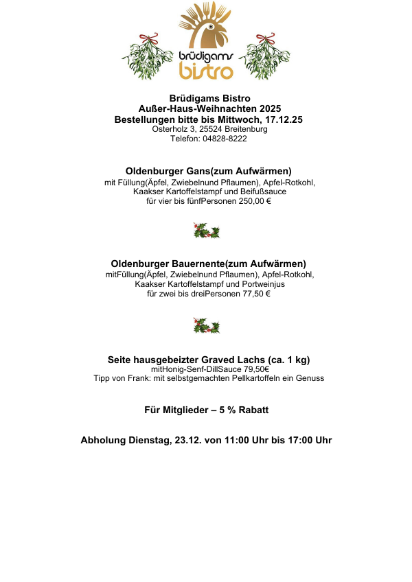 Für alle die Weihnachten gerne lecker Essen aber nach Möglichkeit wenig Arbeit haben, bietet das Team vom Brüdigams Bistro ein tolle Weihnachtsmenü an.